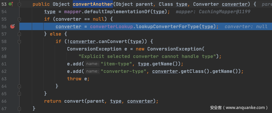在TreeUnmarshaller类的convertAnother方法处下断点,如下图所示