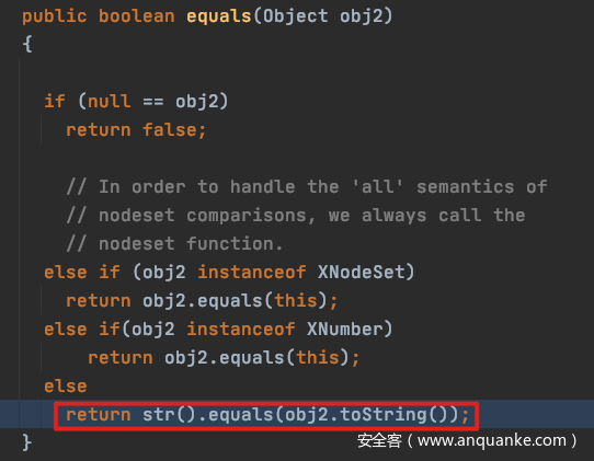 所以跟进Xstring.equals方法,该方法中需要注意的是调用了obj2 也就是传入的XRTreeFrag.toString方法,跟进该方法