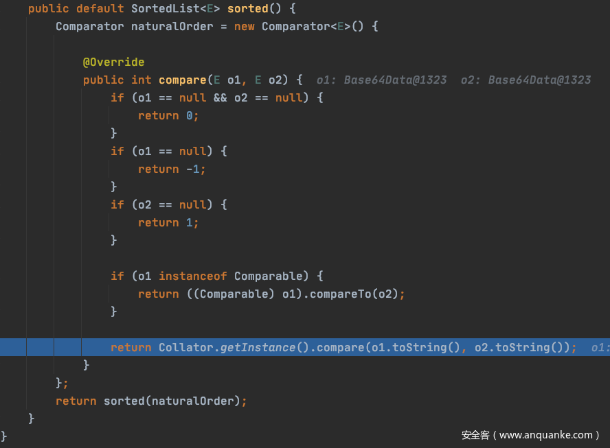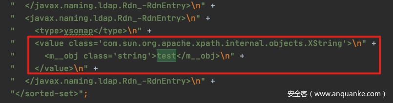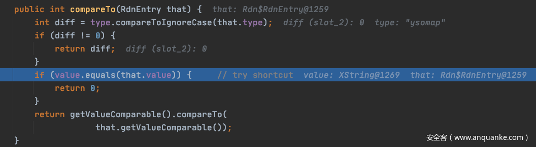 接下来就用jdk1.8.20为例,来进行分析。首先在POC中我们可以直观的看到,有两个Rdn\$RdnEntry的序列化数据,最外层的触发点是Rdn\$RdnEntry.compareTo方法,该方法是对比两个Rdn\$RdnEntry的value属性是否相同。