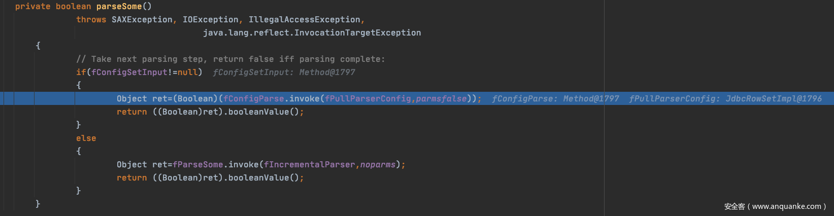 继续向下执行,最终会执行到IncrementalSAXSource_Xerces.parseSome方法,该方法会通过反射调用JdbcRowSetImpl.setAutoCommit方法。