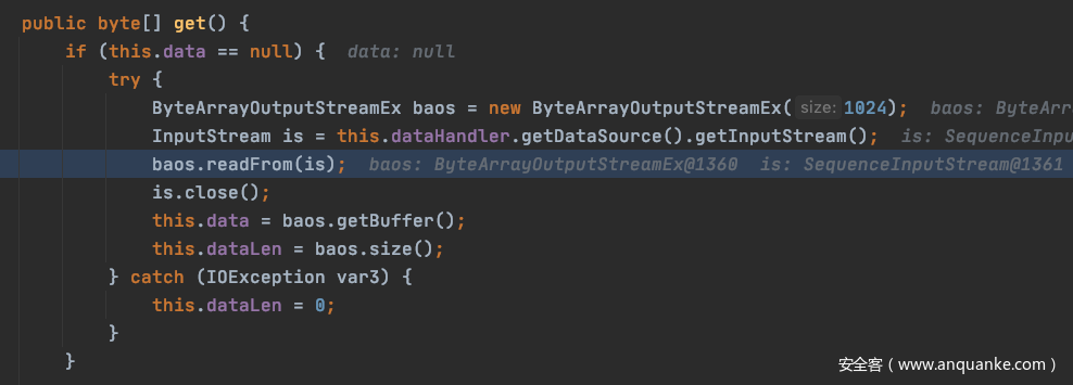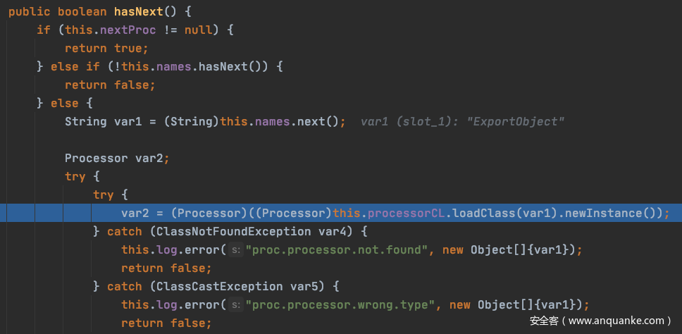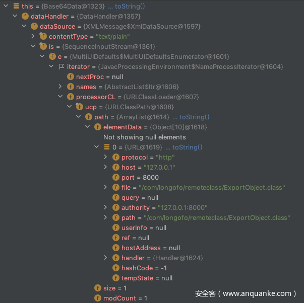 该漏洞的整个利用链和CVE-2021-21345如出一辙,不同的地方在于,最后的加载恶意Class的Classloader不再使用URLClassloader去远程加载,而是采用了com.sun.org.apache.bcel.internal.util.ClassLoader,这里相信对FastJson有了解的同学应该不陌生,这里使用了BCEL的方式来进行恶意代码执行