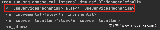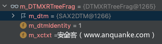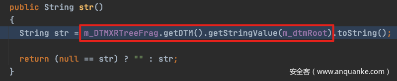 经过一次嵌套调用后,来到XRTreeFrag.str方法中 这里调用了之前就封装在POC中的SAX2DTM对象,如下图所示