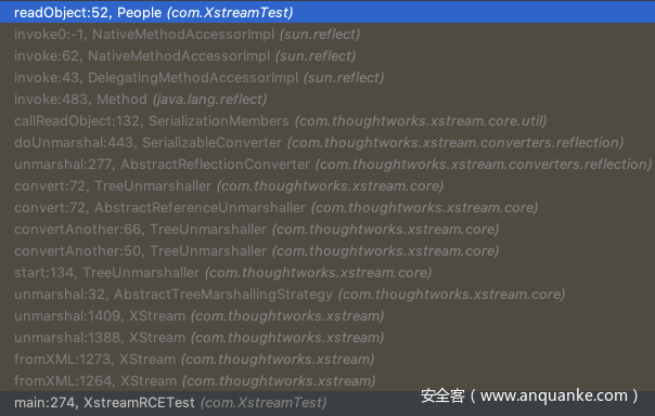 从执行的结果中可以看到最终返回一个ReflectionConverter,当然不同的类型在这里会返回不同的Converter,这里仅仅只是处理我们自定义的未实现Serializable接口的People类时使用ReflectionConverter,该Converter的原理是通过反射获取类对象并通过反射为其每个属性进行赋值,那如过是处理实现了Serializable接口并且重写了readObject方法的People类时会有什么不一样呢?