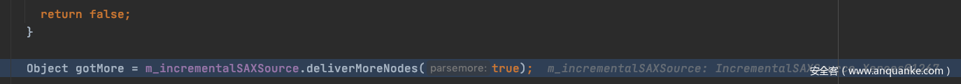 跟入SAX2DTM.getStringValue方法,经过两次嵌套调用后,来到了SAX2DTM.nextNode方法中,该方法中需要注意的是调用了m_incrementalSAXSource属性也就是POC中封装好的IncrementalSAXSource_Xerces对象的deliverMoreNodes方法。