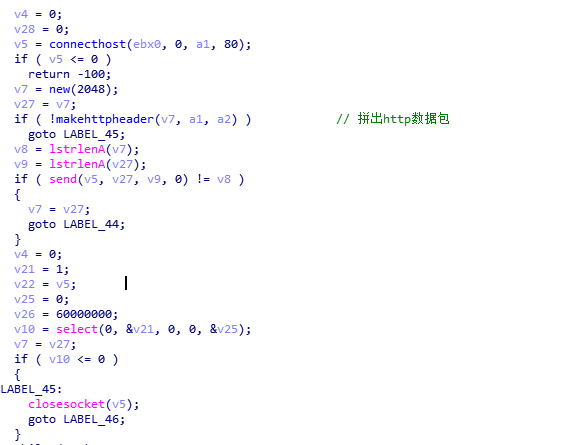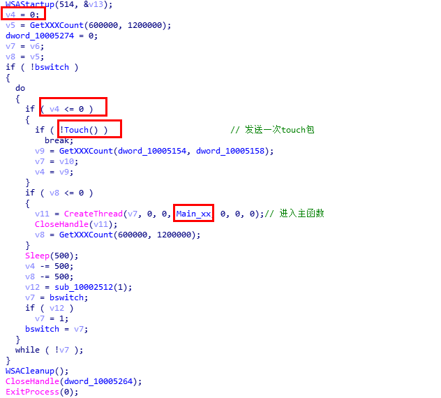 注入后的代码会初始化网络套接字,发送一次touch包,然后创建一个主线程函数,如下: