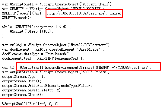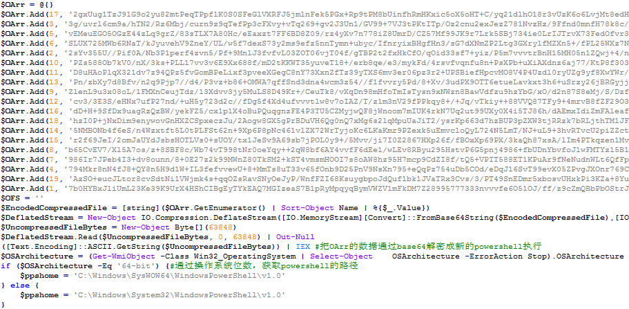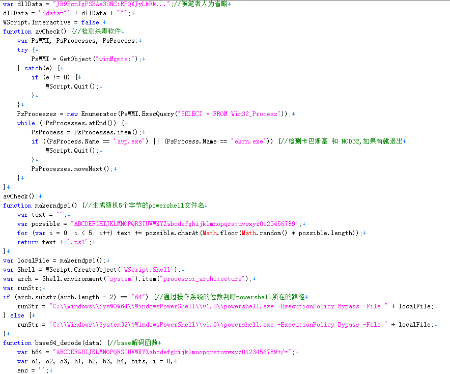 该脚本会首先判断目标主机是否存在卡巴和NOD32程序,如果存在则脚本退出;如果不存在,会把脚本里的“dllData”和“code”两个数据一起写入到一个PowerShell脚本文件中,其名字为随机生成的5个字节。最后执行该PowerShell脚本。