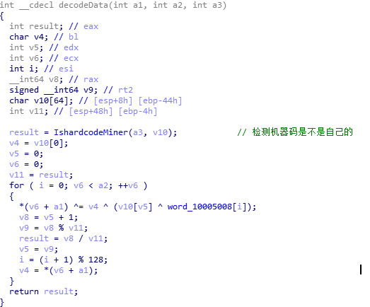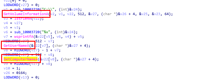 DllMain会首先获取一些硬件信息计算出机器码。机器码是根据驱动器信息、电脑名和用户名算出来的: