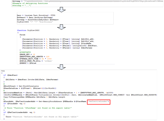 其中“strexp”保存的为远控模块的文件数据,经过base64decode解码得到原始文件内容为一个DLL文件,其导出模块名为socksbot.dll。最后使用ReflectiveLoader技术加载。