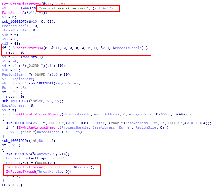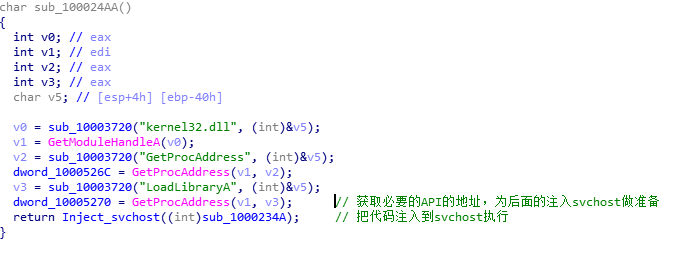 然后会获取GetProcAddress和LoadLibraryA的地址,并把sub_1000234A代码通过复写进程的方式注入svchost.exe宿主中,如图: