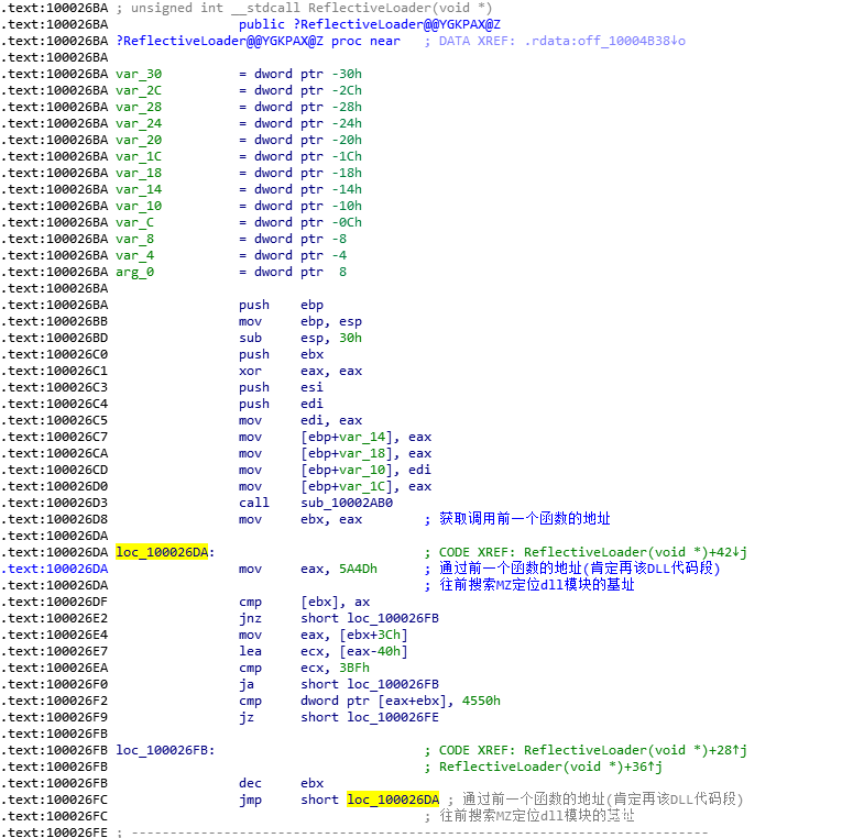 该函数首先获取当前函数的地址,然后往前搜索PE头部“MZ”标志以定位该DLL模块的基地址。