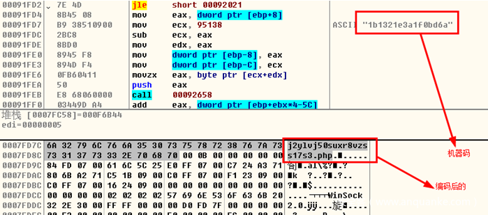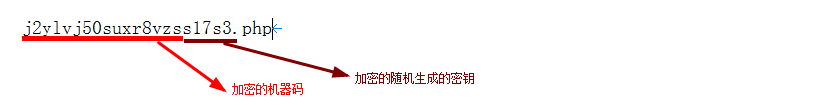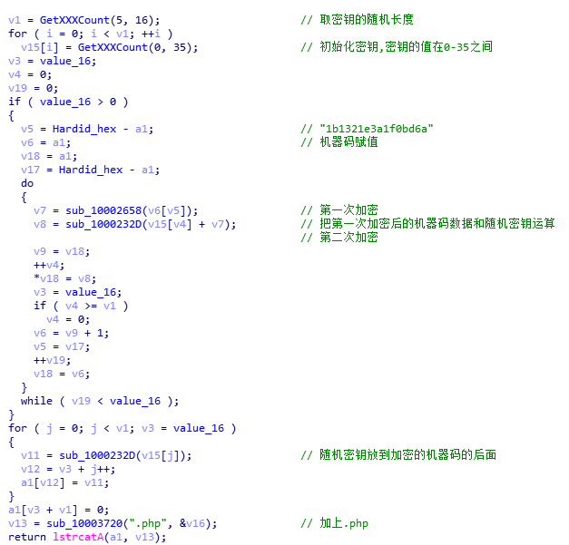 计算后生成的机器码字符串是放到HTTP数据包的GET数据里,例如生成的字符串为j2ylvj50suxr8vzss17s3.php,那么加密后的机器码数据为j2ylvj50suxr8vzss17s3。其前16字节是机器码加密后的数据,从16字节开始到末尾是随机生成的密钥信息,密钥长度在5-16字节随机,数值的范围在0-35随机,然后通过编码成可见字符。