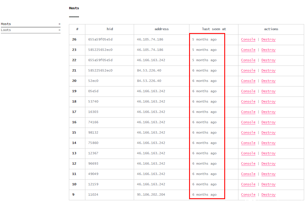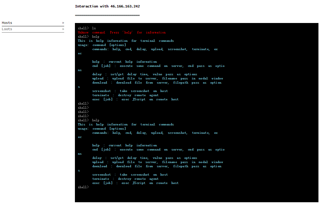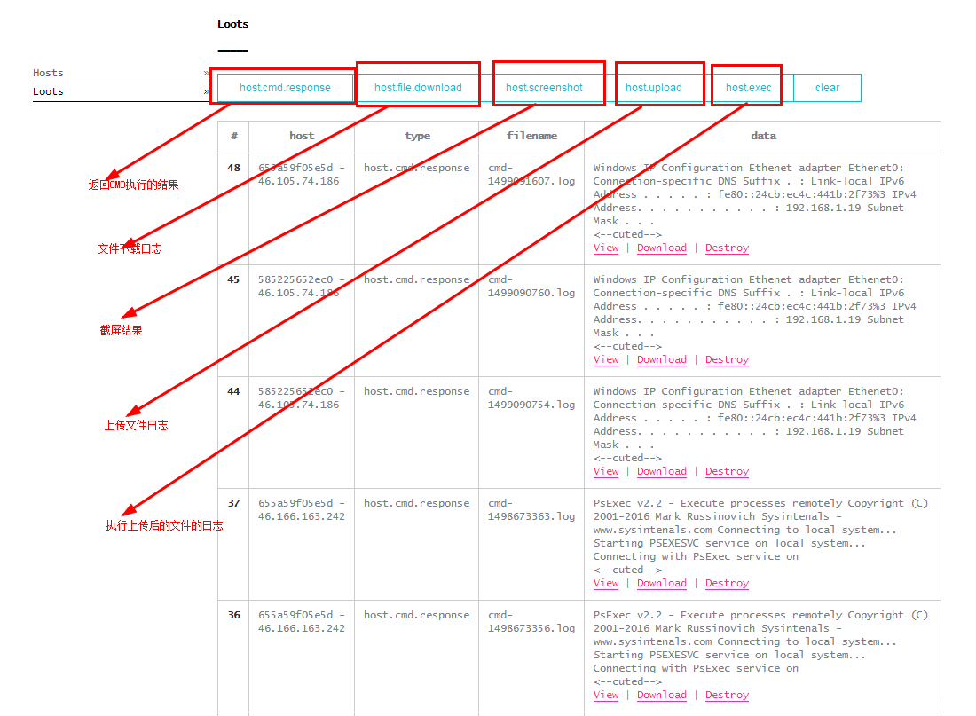 另外一个Loots页面保存了控制端发送控制指令后的一些日志数据,包括执行命令、上传文件、截屏、下载文件、执行脚本的功能。