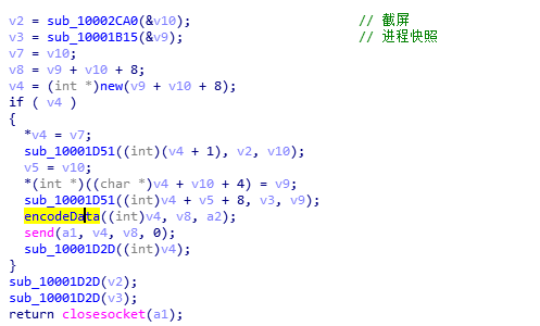 例如这里执行获取屏幕截屏和进程快照信息,并加密发送到控制服务器。