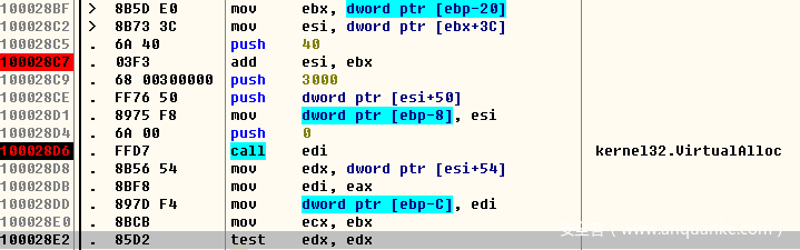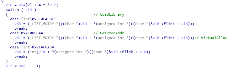 通过hash获取3个函数LoadLibrary、GetProcAddr、VirtualAlloc的地址。