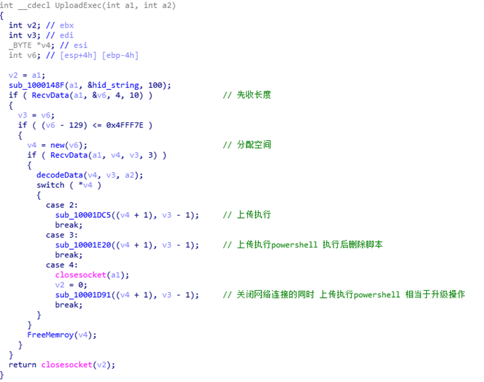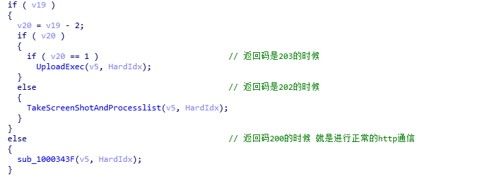 受控端接受到控制服务器下发的指令后,会根据HTTP返回的状态码确定要执行的命令,例如返回码是203的时候就会上传执行,返回码是202的时候就会截屏和获取进程列表。