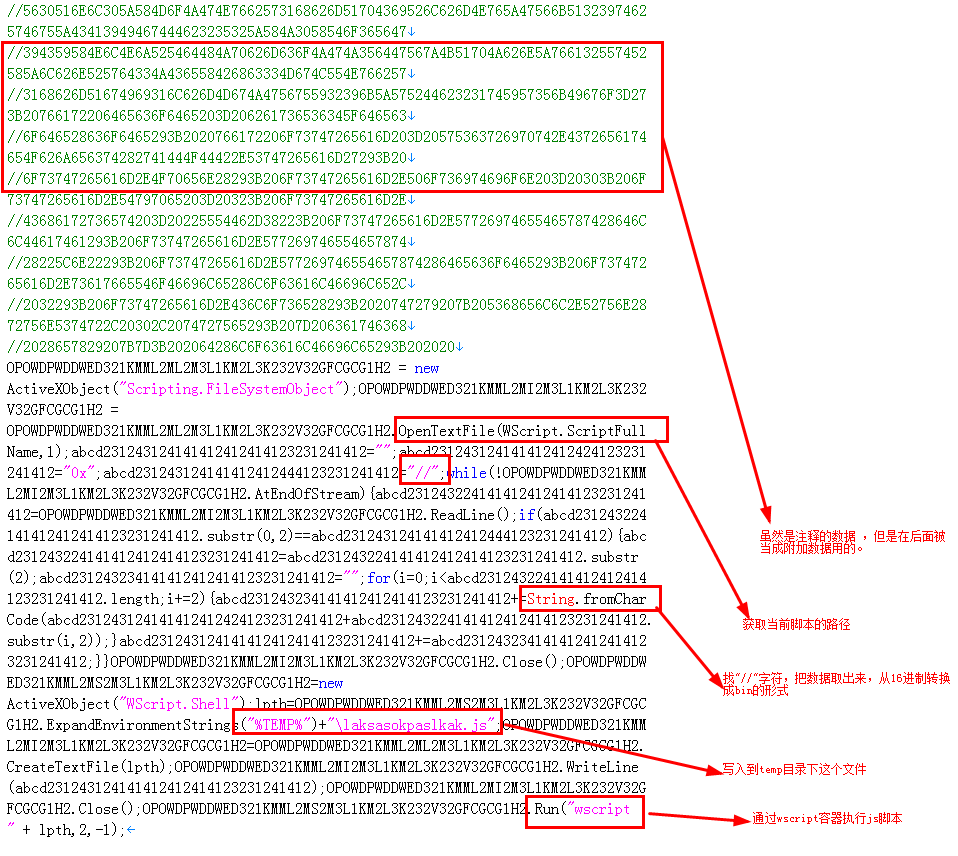 Dropper JS是一个96KB的脚本,其会释放一个中间JS脚本。其前面部分为hex形式的附加数据被作为注释语句存放;后面的脚本会先获取当前正在执行脚本的路径,并读取自身文件数据,找到前面注释的附加数据拼接起来,转换成二进制形式,保存到”%temp%\laksasokpaslkak.js”,最后通过WScript容器执行这个脚本。