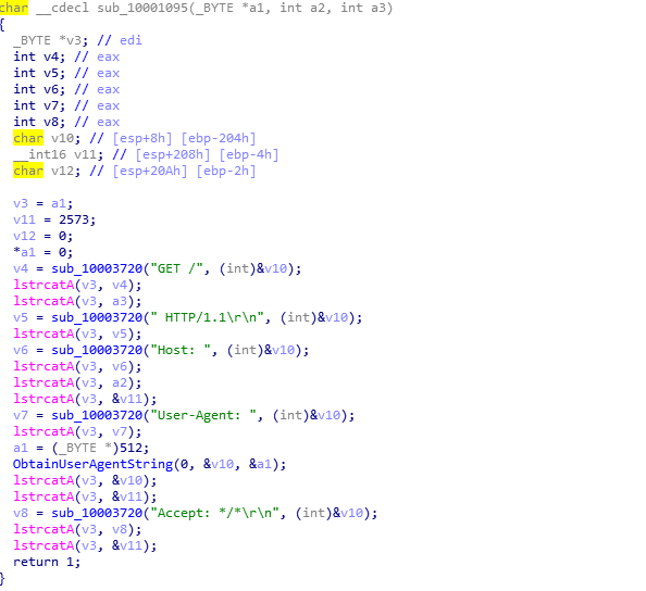 如图为构造HTTP数据包的函数,UserAgent是通过ObtainUserAgentString函数生成的。
