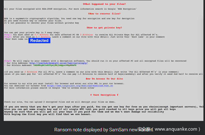 多数勒索软件都试图说服受影响用户称他们有能力在收到款项后解密数据。SamSam 也不例外,甚至还显示了如上截图中的免责声明,表示,“我们不想损失我们的可靠性,我们是‘诚实的’。”