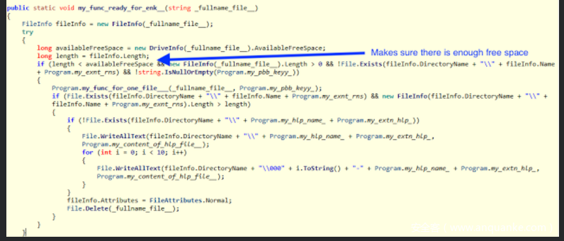 和此前的 SamSam 变体一样,这个新变体在确保当前硬盘具有足够大的空间以便创建加密文档方面十分小心,从而避免发生损坏导致加密不可恢复情况的出现。