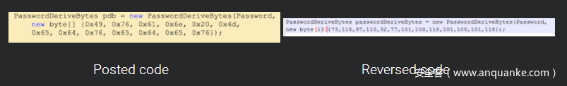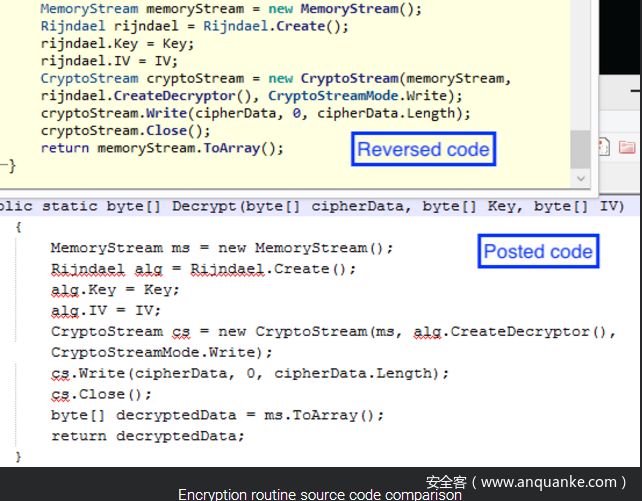 从如下图片中可看出,Rijndael 加密中使用的 IV 和两个实现(鉴于反编译实现的不同,分别用十六进制和十进制表示 “配置代码 (posted code)” 和 “逆向代码 (reversed code)”)中的 IV 一样。