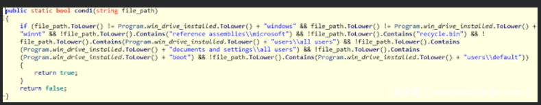 虽然此前的 SamSam 版本通过 API 调用 DriveInfo.GetDrives() 来获取可用驱动的列表,但这个新版本将驱动字母硬编码。检查驱动准备好后,它会开始从非黑名单上的文件夹路径搜索目标文件。