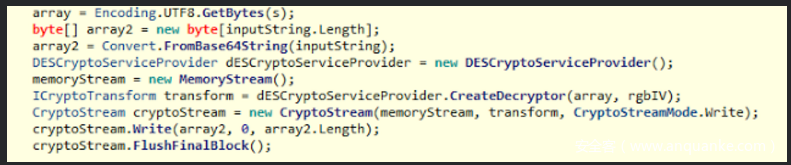 SamSam 此前的版本通过AES 加密字符串对恶意软件代码进行了混淆。这个新变体也具有混淆函数、类名称和字符串,其中包括目标文本扩展的列表、“帮助”文件内容和环境变量,这次使用的 DES 加密带有固定的硬编码密钥和 IV。