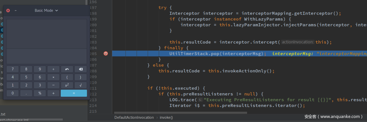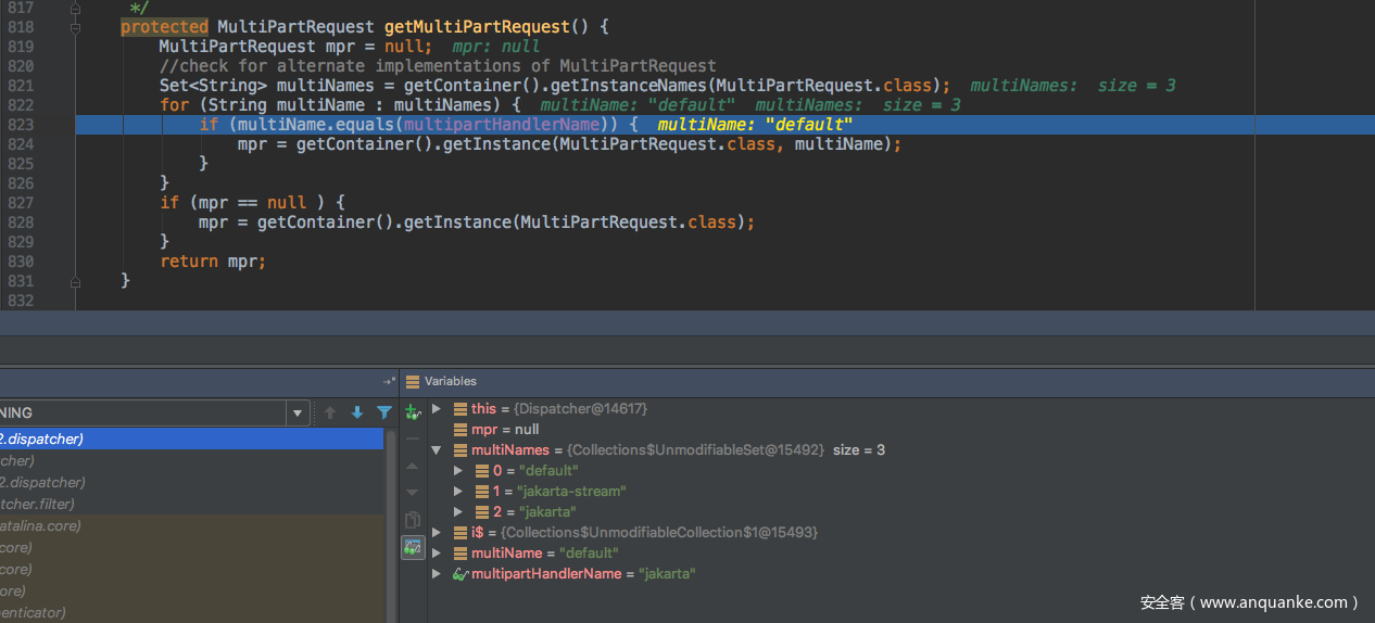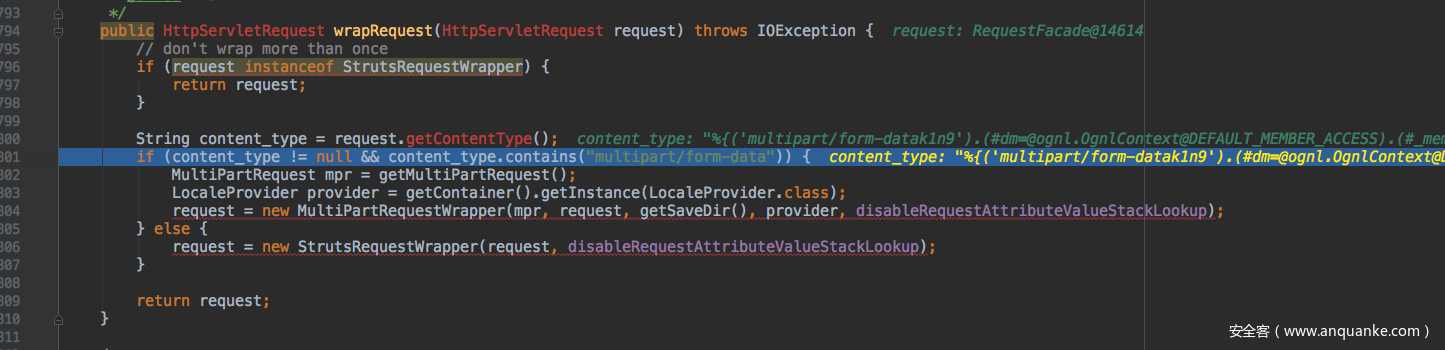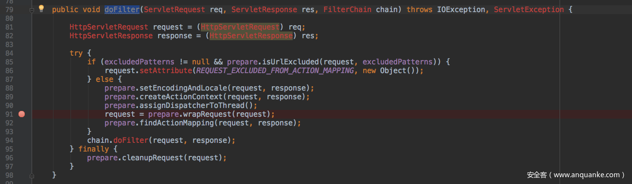 使用JavaAgent来查看调用栈的好处在于只有payload和漏洞环境的情况下就可以大致知道漏洞的利用过程,方便接下来做动态分析。下面再使用动态分析的方式来跟一下漏洞利用的整个过程,struts2会在StrutsPrepareFilter过滤器中将HttpServletRequest请求封装成StrutsRequestWrapper或是MultiPartRequestWrapper。而这个漏洞就是发生在对MultiPart请求的处理上,在StrutsPrepareFilter类中的doFilter方法中下断点即可。对于这里Get或是Post请求都是一样的