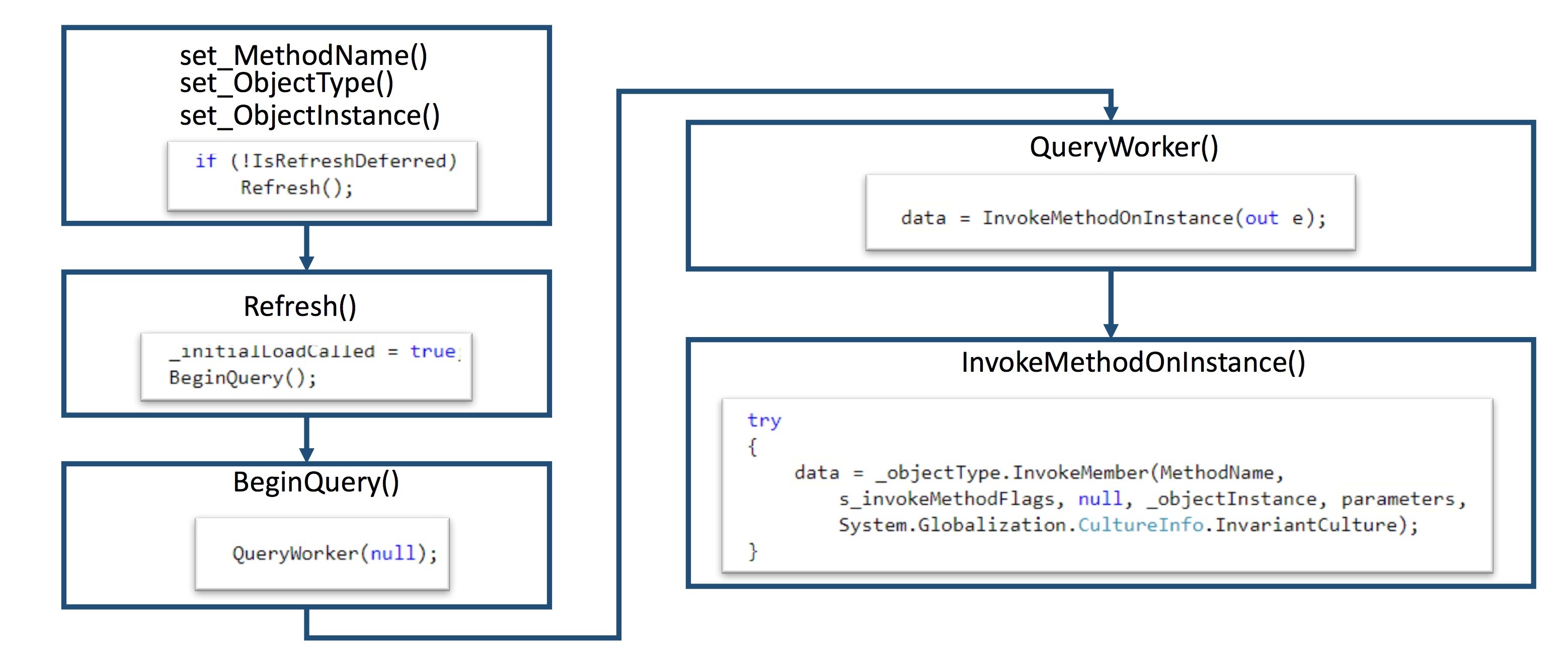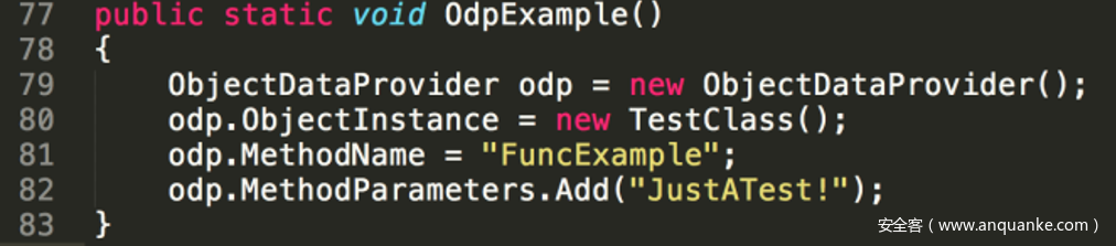 相当于调用了TestClass.FuncExample(“JustATest!”),ObjectDataProvider中的成员变量都进行了封装的,并且每次调用了setter后都会检测参数是否足够,足够了的话便会自动去调用传入的方法。其中的过程借用BlackHat议题中的一张图来展示。