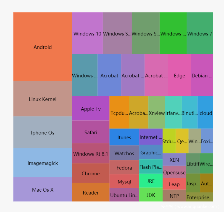 将2017年所有披露的漏洞进行数据分析,统计出漏洞数top50的产品。其中系统类20个产品,应用类30个产品。可以看到漏洞最多的是Android,Linux Kernel,Iphone OS,分别841,435,387枚漏洞。