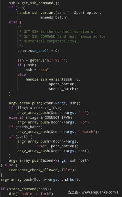 在进行git clone 时候会调用到git/connect.c中“struct child_process git_connect(int fd[2], const char url,const char *prog, int flags)”函数。其接受到的参数url为命令中“git clone xxx://xxxxxxxxxx/xx(.git)”的xxx://xxxxxxxxxx/xx(.git)部分。在该函数中会对传入的这个字符串进行parse,提取其协议部分。在满足协议为ssh://的时候会进入该函数的else部分。