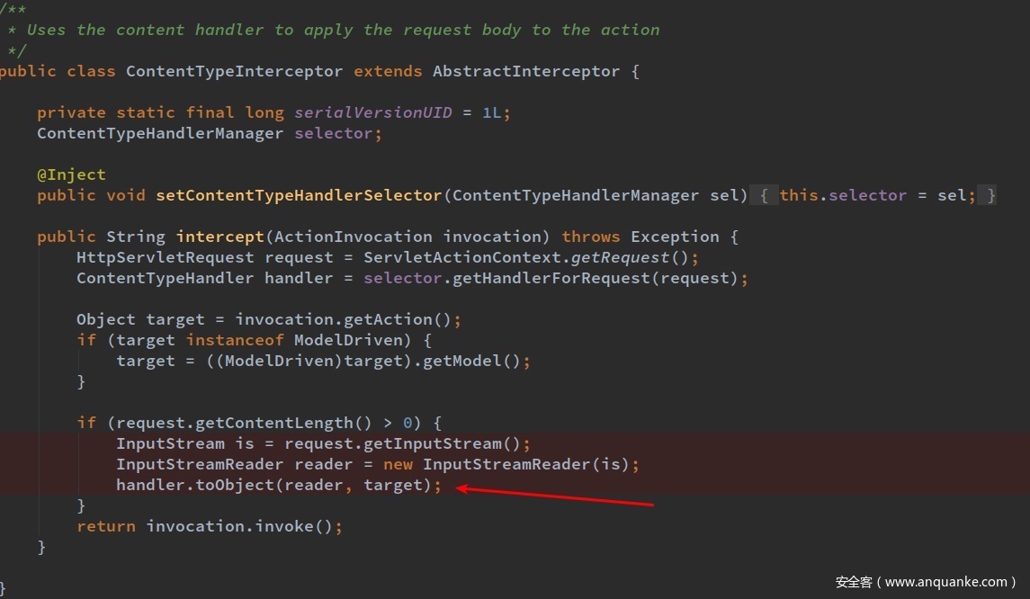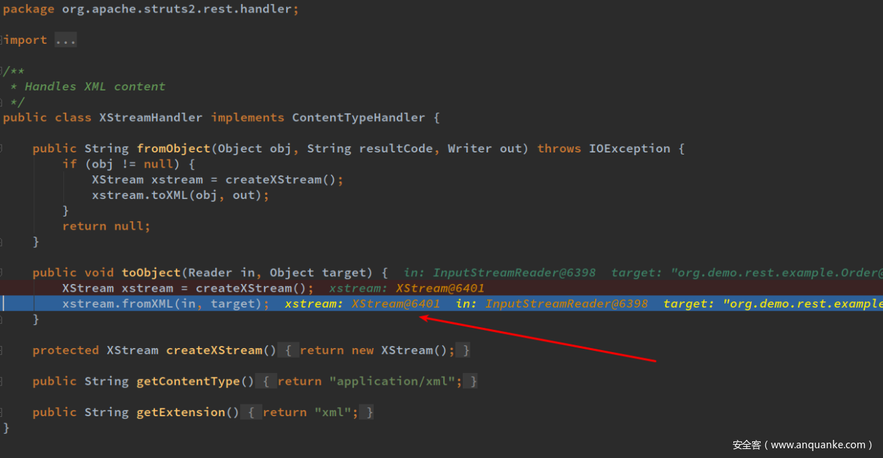 在struts2 rest-plugin 中的处理逻辑里接受到对应格式的消息时,会调用已经注册的对应handler的 handler.toObject方法对其进行实例化,在这里传入的xml消息,所以就会跳转到已经定义的XStreamHandler的toObject方法