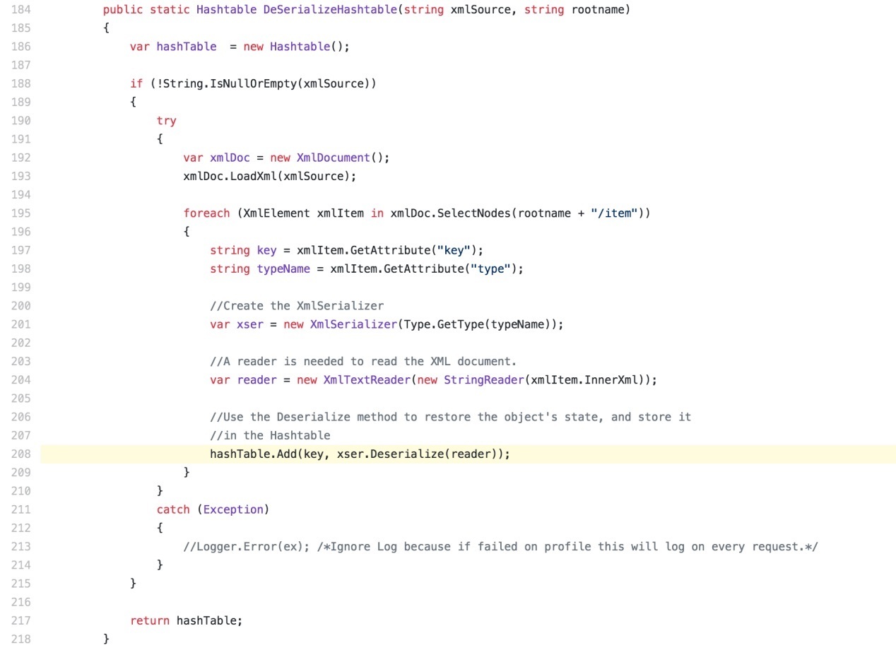 这个方法会使用item元素中的type属性值来设置类型,并且会在208行这里将该元素的内容进行反序列化,这里便是漏洞的触发点了。漏洞代码中从可控输入点到最终可利用处的这个过程还是比较直观的,接下来是针对像这样使用了XmlSerializer来反序列化的漏洞点进行攻击利用分析。