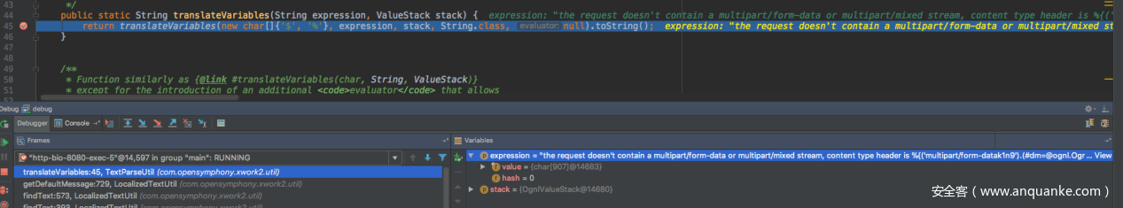 可以看到这里有一个对ContentType的值得判断,要不是以“multipart/”开头的话便会抛出一个InvalidContentTypeException的异常,跟下去看它对这里的异常信息是如何处理的,因为这个异常信息里是包含着Content-Type的值的,也就是说里面包含着payload中构造好的OGNL表达式。再往下跟直到OGNL表达式执行就是一开始通过JavaAgent看到的调用栈中的过程了,看一下translateVariables方法: