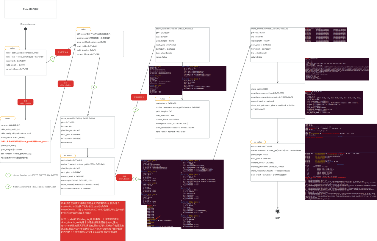 将配置文件/usr/exim/configure中的“control = dkim_disable_verify”注释,可以触发进程崩溃,进而控制rip,分析原因如下: