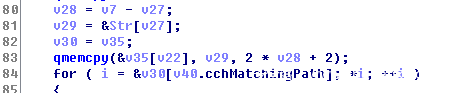 在qmemcpy(&v35[v22], v29, 2 * v28 + 2)函数中