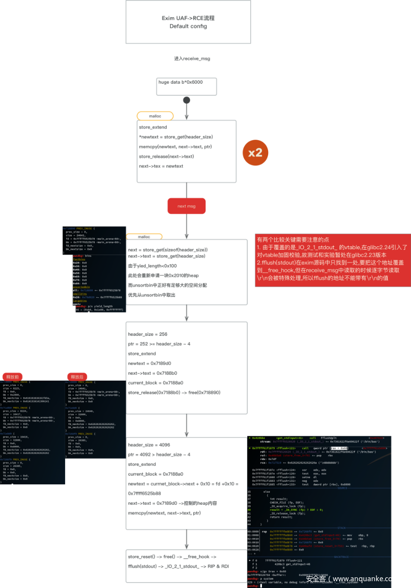 在devcore公司公布具体细节后,我们对默认配置下如何控制rip进行了分析。其实原理和开启dkim配置类似,需要在top_chunk前分配一块在使用的堆块,防止后面释放的堆块和top_chunk合并,作者的poc是利用DATA来发送一个足够大的数据来扩展堆块,循环多次后,期间释放了之前的堆块,变成了一个大的unsorted bin块供后续分配。此时top_chunk之前就有了正在使用的堆块,再利用BDAT命令达到控制rip的目的。