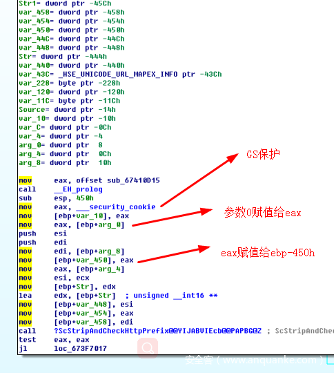 可以看到因为对复制长度没有做限制,目标地址在ebp-450h上,在这里造成了栈溢出发生。如果想通过覆盖返回地址执行任意代码,会看到起用了栈保护机制,想要攻击成功会破坏security_cookie。