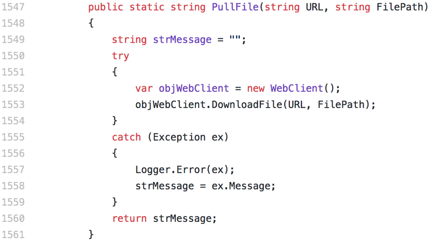 如此一来要是被序列化的是一个ObjectDataProvider类,那么在反序列的时候便可以做到任意方法调用的效果。再找一个存在能达到想要的利用效果的方法的类就行了,例如DNN中的就存在一个可以做到任意文件上传效果的类,DotNetNuke.Common.Utilities.FileSystemUtils中的PullFile方法: