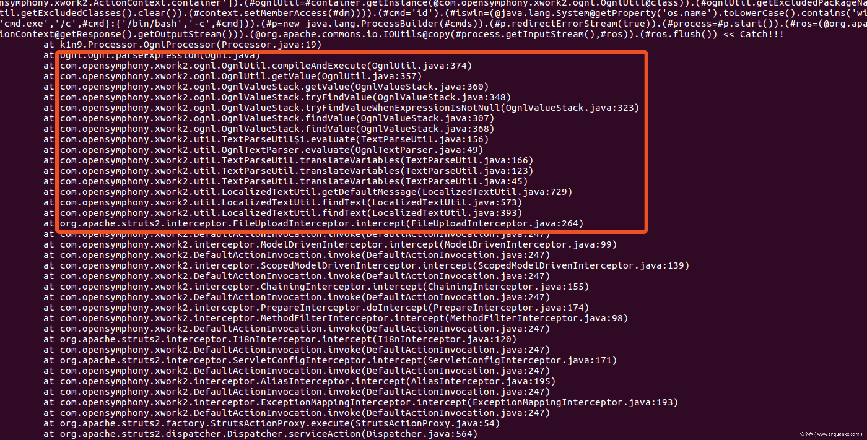 其中异常信息含有完整的文件名,这里的异常信息也经过了和S2-045一样的处理,也就是说文件名中的OGNL表达式也会被执行。针对该漏洞的利用只需要在模拟文件上传时在Content-Disposition的filename中加入空字节,并将OGNL表达式写到filename就好S2-046还有一个触发方式是Content-Length长度超过 2M,但是这种触发需要配置struts.multipart.parser为jakarta-stream才行。