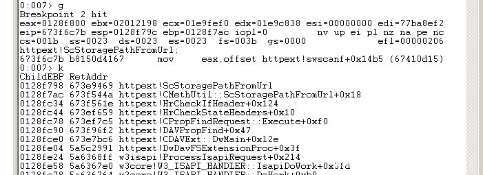 对漏洞函数ScStoragePathFromURL打断点,并查看栈回溯。可以发现调用栈中的DAVPropFind。对Execute成员函数进行分析,调用了HrCheckStateHeaders,进而调用HrCheckIfHeader