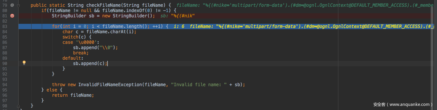 S2-046是在S2-045的基础上的,触发流程一样,触发点不一样了。在Streams类中的checkFileName方法会对文件名进行检查,若是包含空字节的话会抛出InvalidFileNameException异常。