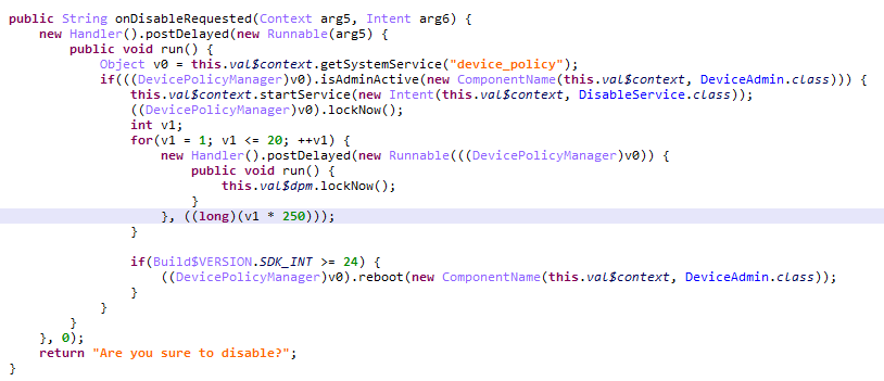 图6.显示HiddenMiner如何防止移除设备管理员权限的代码片段