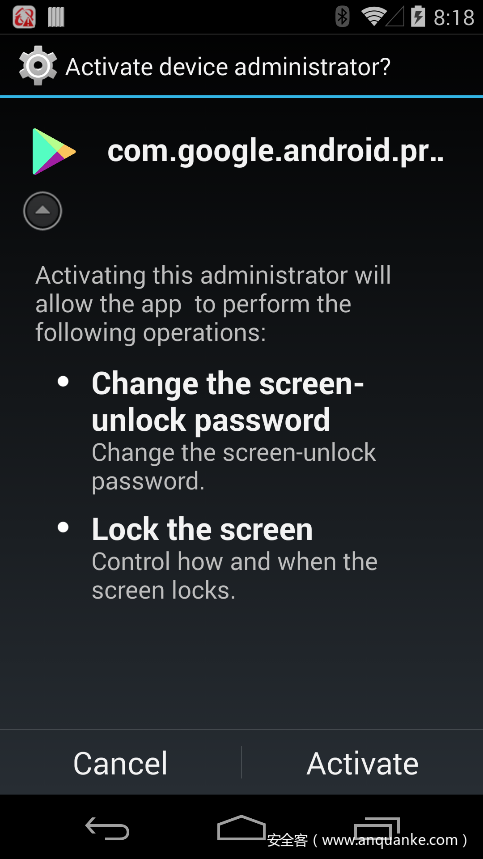 图2.恶意应用程序的屏幕要求用户以设备管理员身份激活它