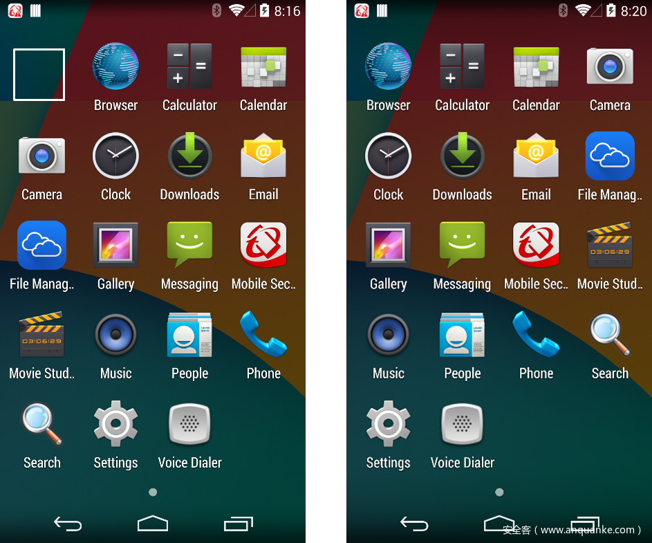 图3. HiddenMiner如何隐藏自身的图例:安装后的空应用程序名称标签和透明图标(左),然后一旦授予设备管理权限就会消失(右图)