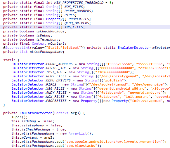 图4.代码片段显示了HiddenMiner如何绕过基于我们的沙箱检测和分析的Android模拟器