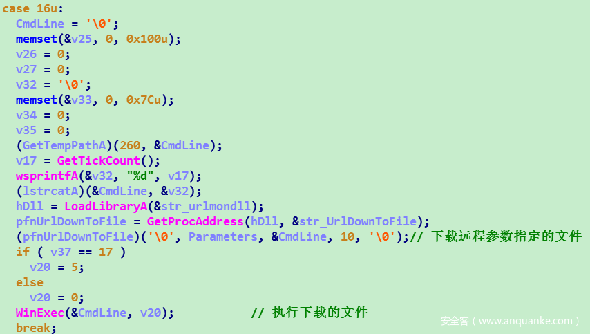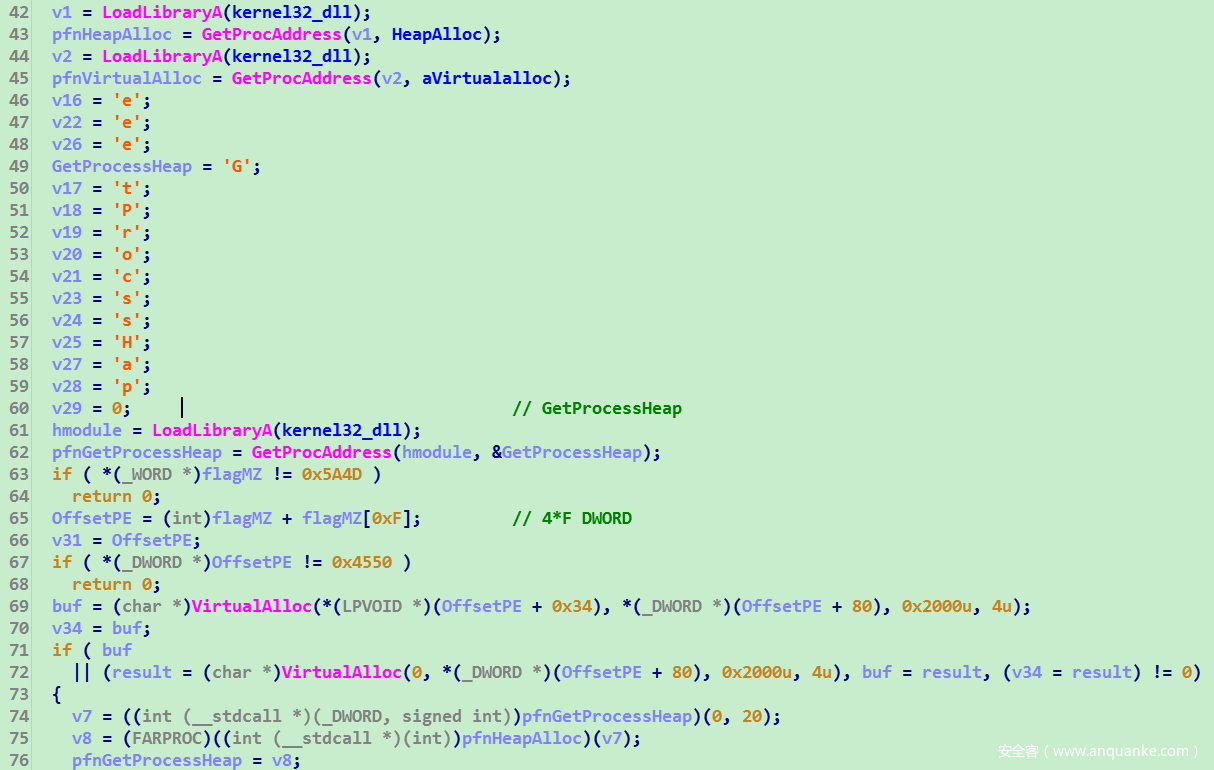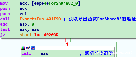 然后计算导出函数ForShare82的位置,调用导出函数。至此,木马本体已经完整加载到内存并运行。