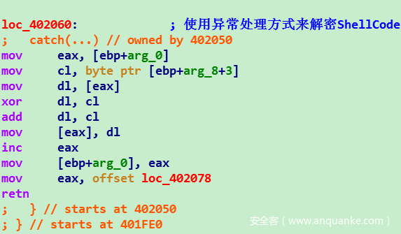 解密木马的功能位于防封插件.exe程序的异常处理里。由程序主动抛出整型异常,进入相应的异常处理函数,解出木马。