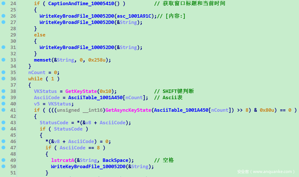 键盘记录功能:判断键盘输入的内容,然后格式化键盘信息,过滤特殊按键(SHITF、CTRL等),最后重组成完整的输入信息,写入文件。