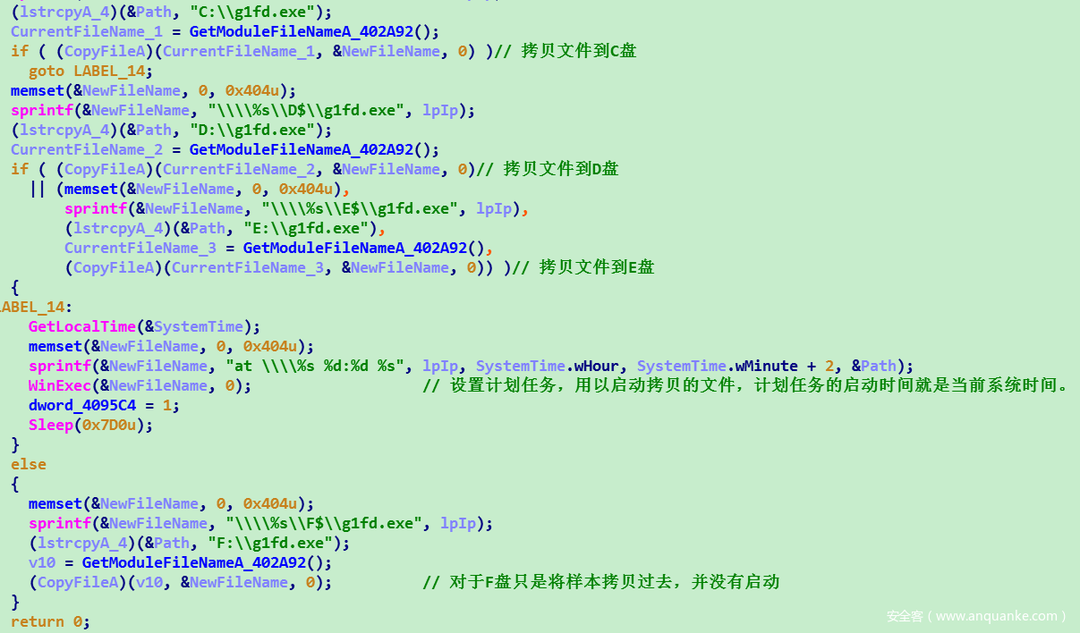 3)创建局域网传播线程,尝试弱口令连接局域网内的用户,将自身拷贝到本地磁盘和局域网共享目录的C、D、E、F盘下并重命名为g1fd.exe,其中成功拷贝至C、D、E盘时,会以计划任务的方式直接启动。